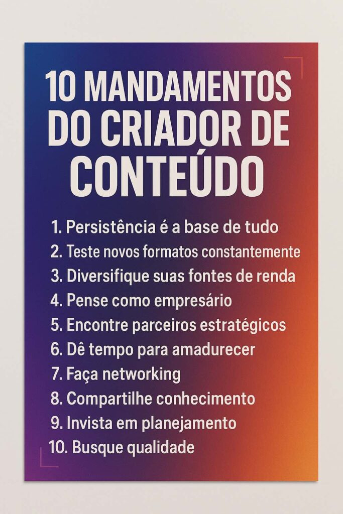 Ao final do episódio, Bruno e Diogo transformaram os aprendizados da conversa em uma espécie de “tábua dos 10 mandamentos do criador de conteúdo” — que ainda está em construção, mas já começou com os seguintes princípios: