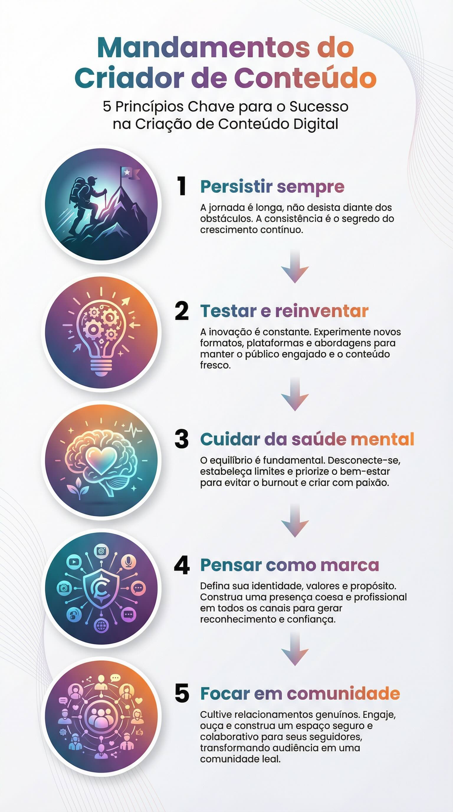 Com base em sua vasta experiência, Pedro Caxa, em conjunto com a discussão na entrevista, nos deixa lições valiosas que podem ser resumidas em cinco mandamentos essenciais para quem deseja construir uma carreira sólida e sustentável na criação de conteúdo.